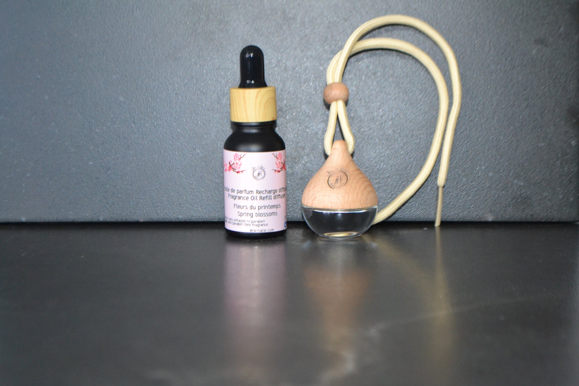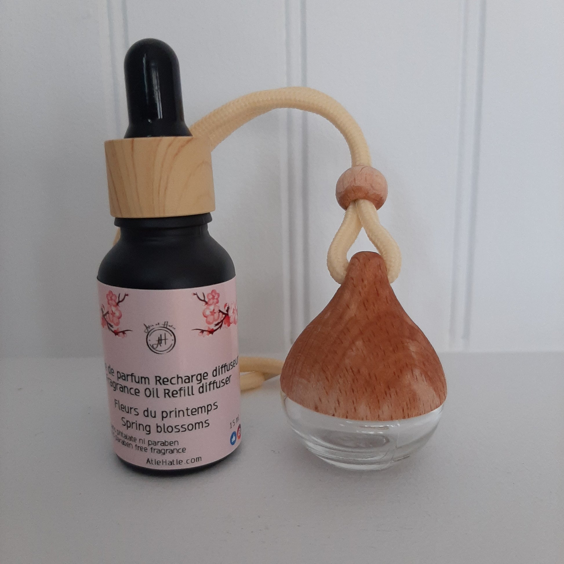 - Pour the diffuser slightly to the side so that the liquid soaks into the wooden stopper. Hang in your car, wardrobe, or any other place you want to scent.